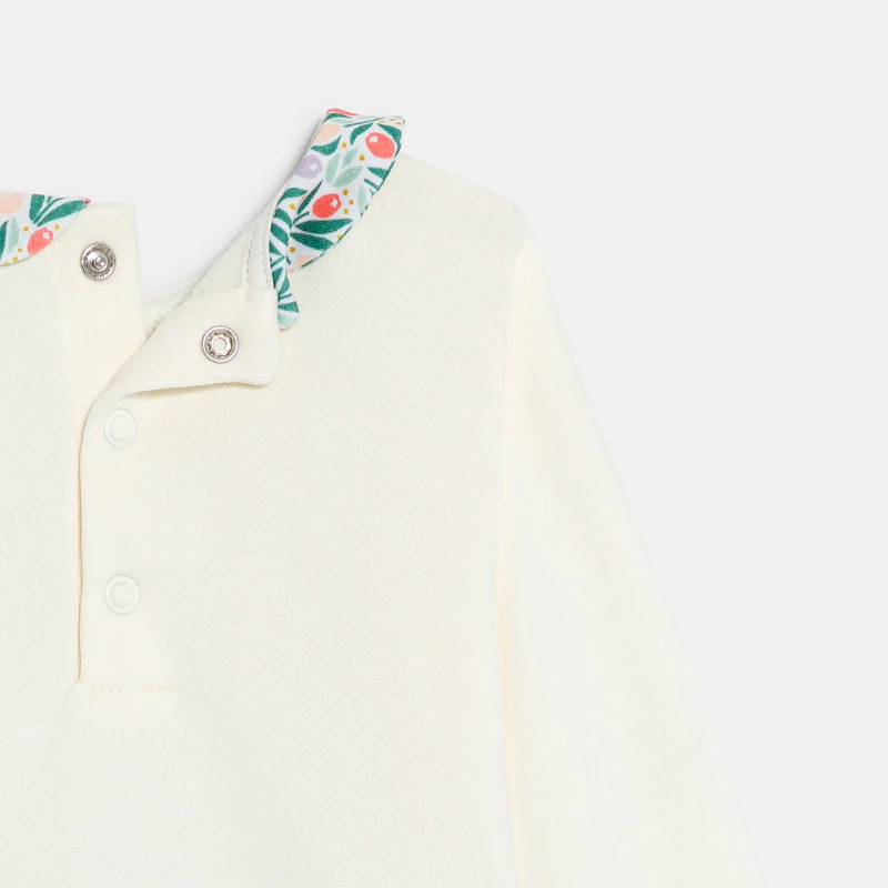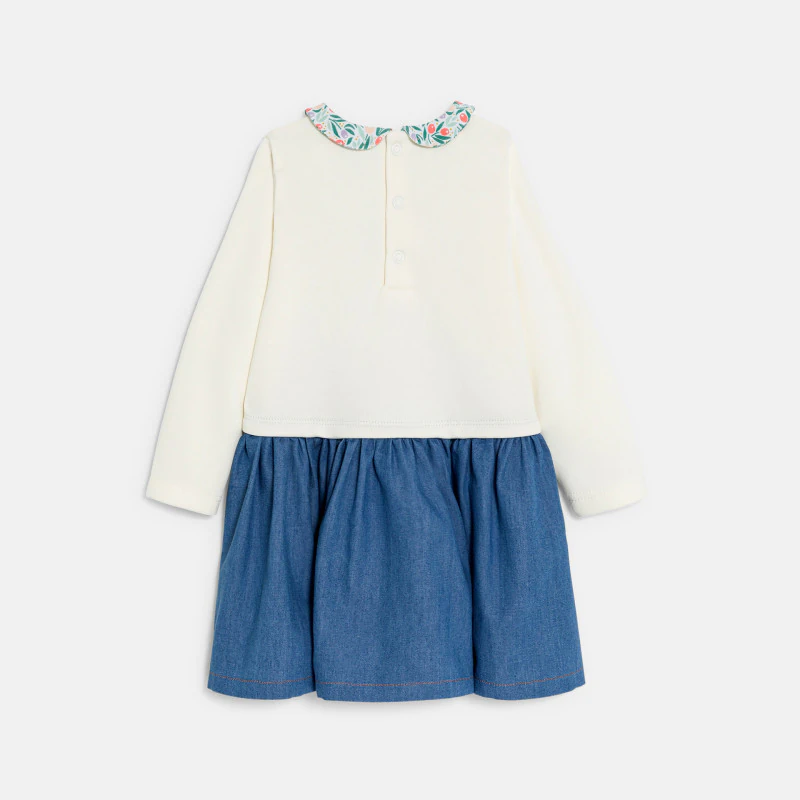 بميزته 2 في 1، يستوفي هذا الفستان كل الشروط ! مثالي لهذا الفصل، فهو يدفئ الفتيات بجزء علوي من الصوف الناعم بياقة زهرية وتنورة فضفاضة من القطن. الغلق بأزرار ضغط على الظهر لكي ترتديه الصغيرات بسهولة.