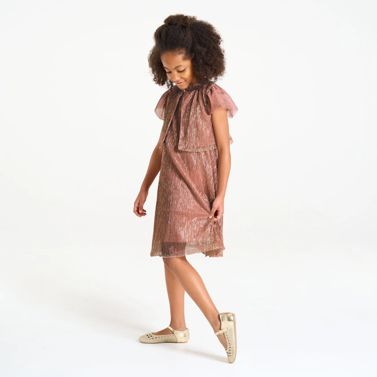 قماش لاميه مطرز بالترتر والتول الوردي... الأناقة هي عنوان الأعياد هذا الموسم. الفتيات تعرف ذلك: لا داعي لانتظار مناسبة خاصة للتألق في المجتمع! قصة واسعة من الأسفل قليلًا. تأثير 2 في 1 مع التأثيرات المتداخلة. أكمام فراشة للبنات. ياقة مستديرة مع تطريز من التول. بطانة.