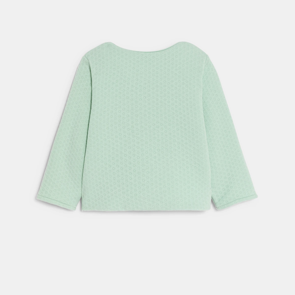 جانبان لطرازين مختلفين، يضفي لمسة نابضة بالحيوية على خزانة ملابس الفتيات! الفتيات تحب هذه السترة المصنوعة من الصوف الناعم المخرم، باللون الأزرق من جهة ورسوم أزهار من جهة أخرى. الإغلاق بأزرار كبس.