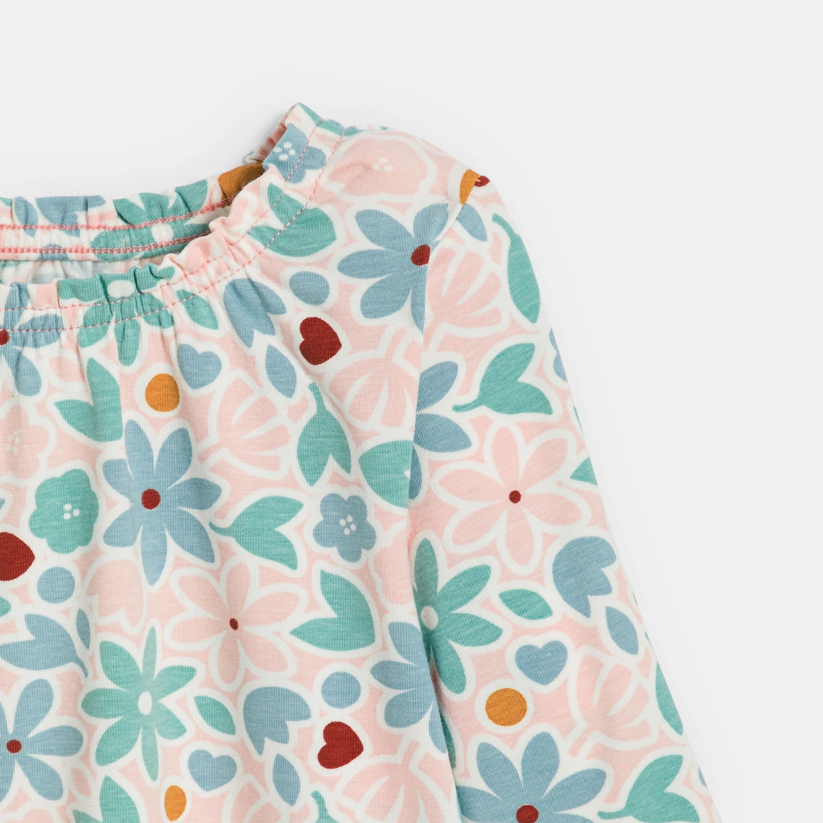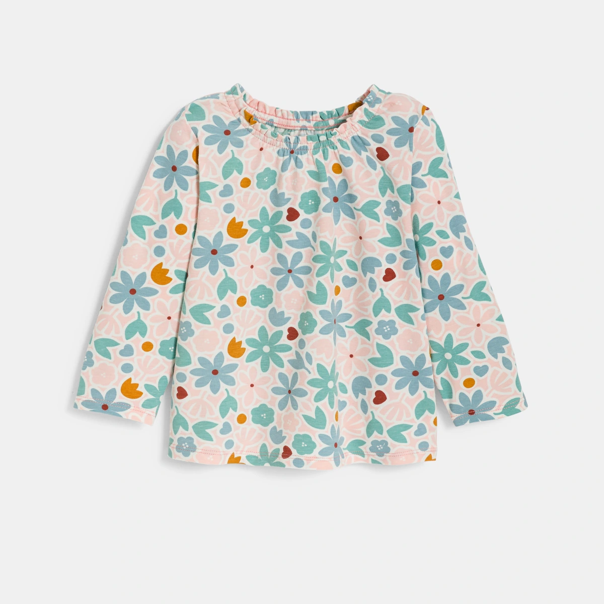 بلوزة بطبعة زهور مع رقبة مطاطية باللون الوردي للفتيات الصغيرات.