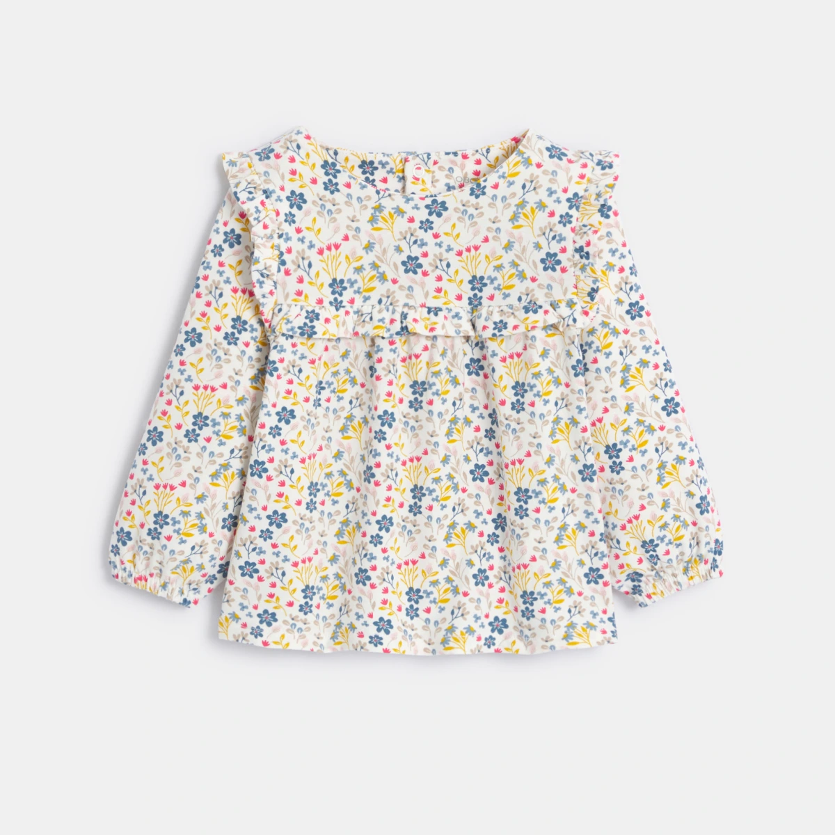 لمسة من الرومانسية في خزانة ملابس الفتيات الصغيرات اللاتي يقدرن الروح الريفية على هذه البلوزة! بلوزة منسوجة مع كشكشة عند فتحات الذراعين لإضفاء لمسة زهرية على الإطلالة. أكمام طويلة مطاطية وفتحة على الصدر. قصة واسعة والإغلاق بأزرار كبس على الظهر.