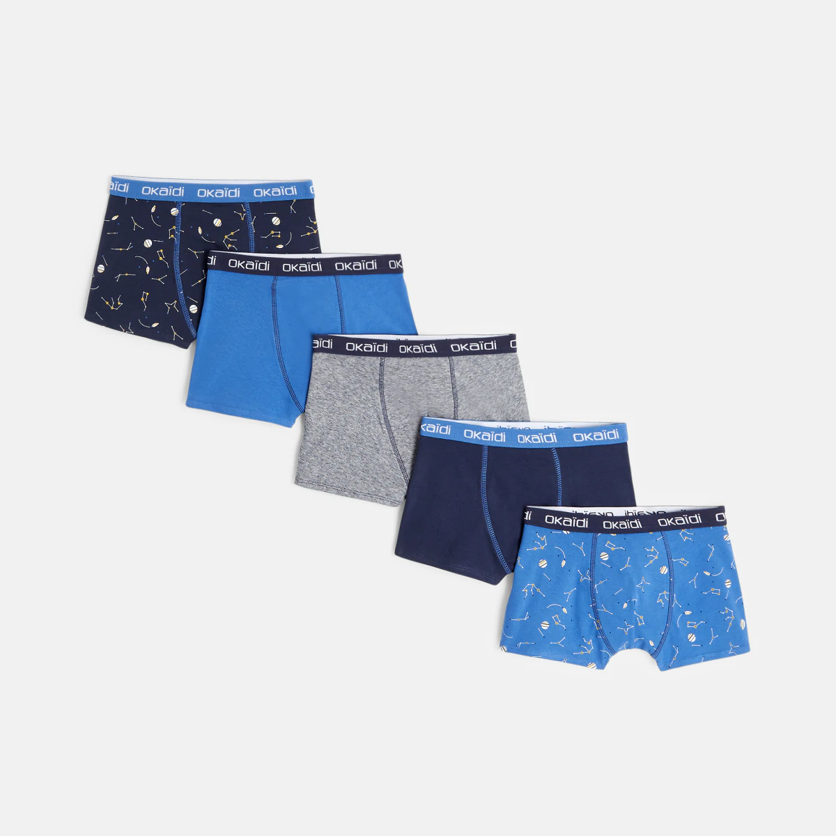 These 5 different boxer shorts offer the comfort and softness of jersey. Boys' underwear. Soft stretch jersey. Elasticated waistband Okaïdi logo. Flatlock seams. Pack of 5.